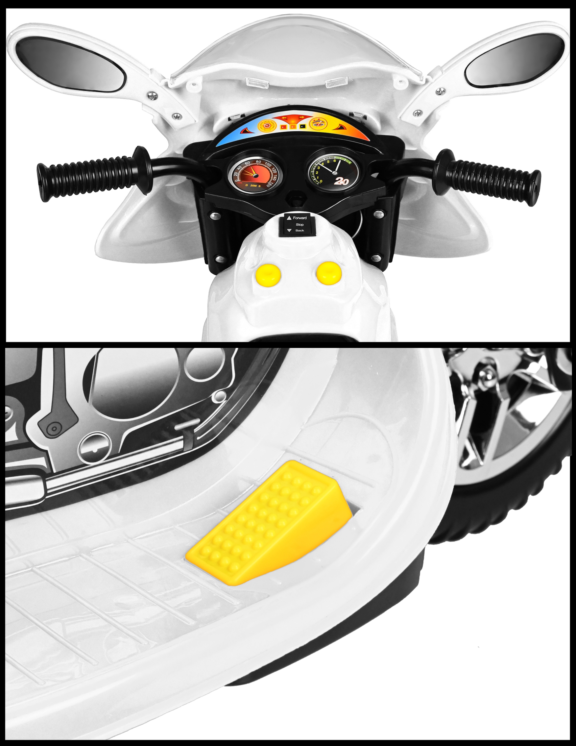 - Naklejki z imitacją liczników dzięki czemu motorek jest jeszcze bardziej realistyczny i przypomina prawdziwego ścigacza.