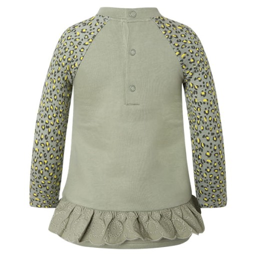 Дуже зручна і приємна на дотик туніка для дівчинки з воланом внизу.Застібається ззаду на два гудзики, відмінно підійде до колготок і легінсів. Модного кольору хакі з деталями та рукавами з леопардовим принтом.