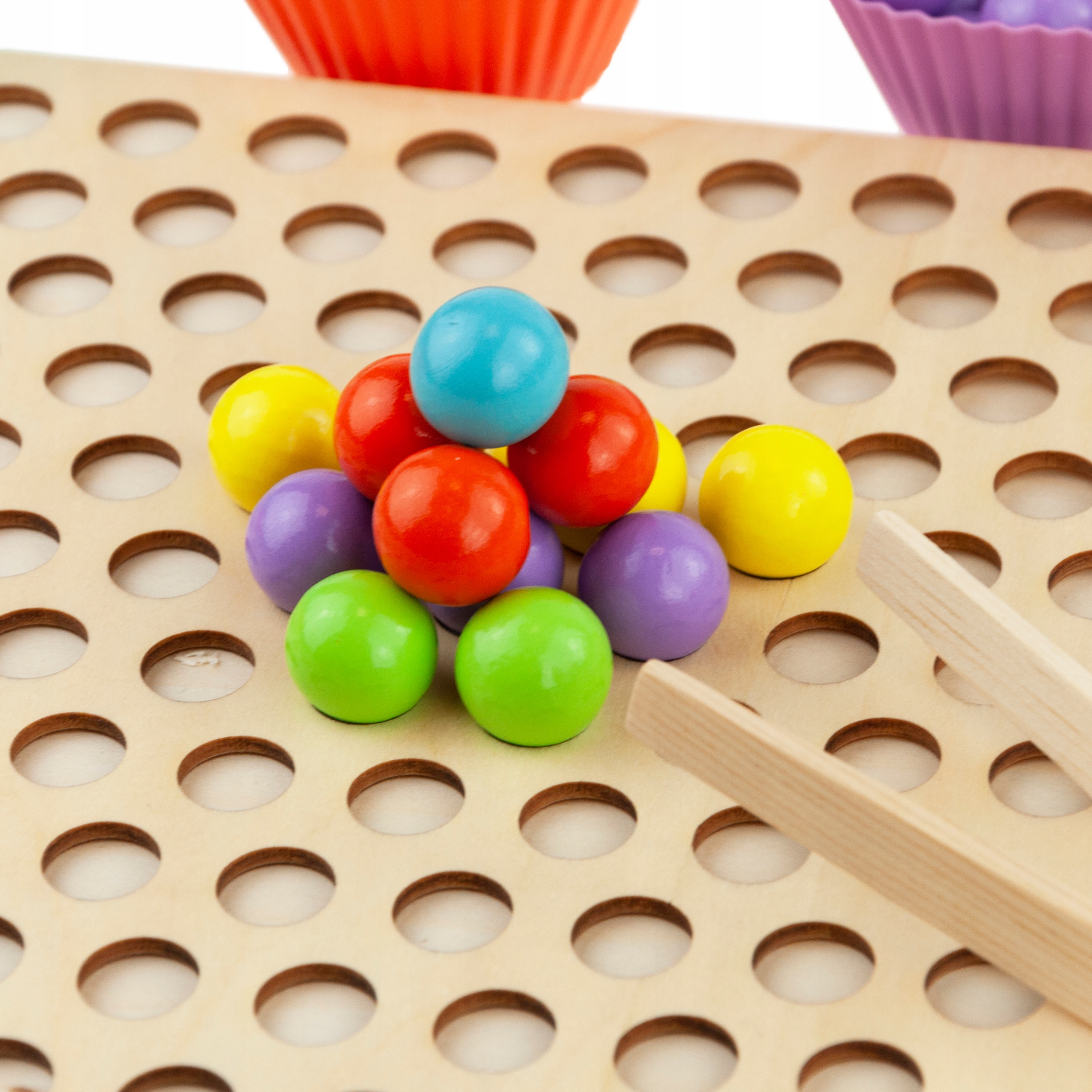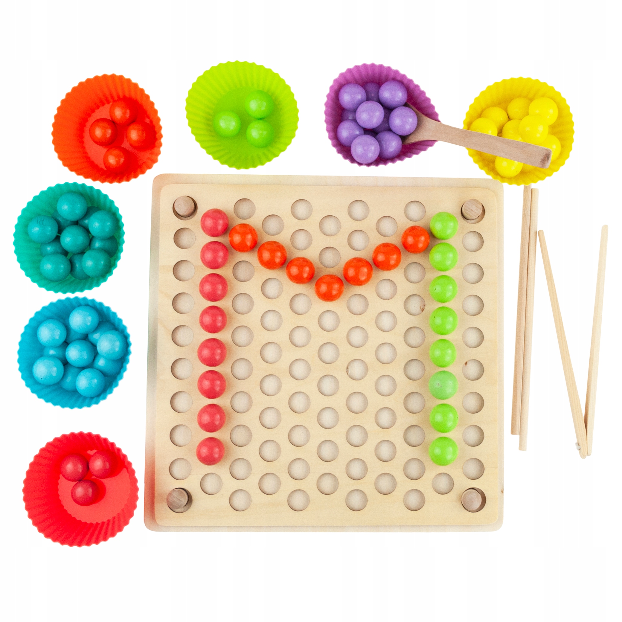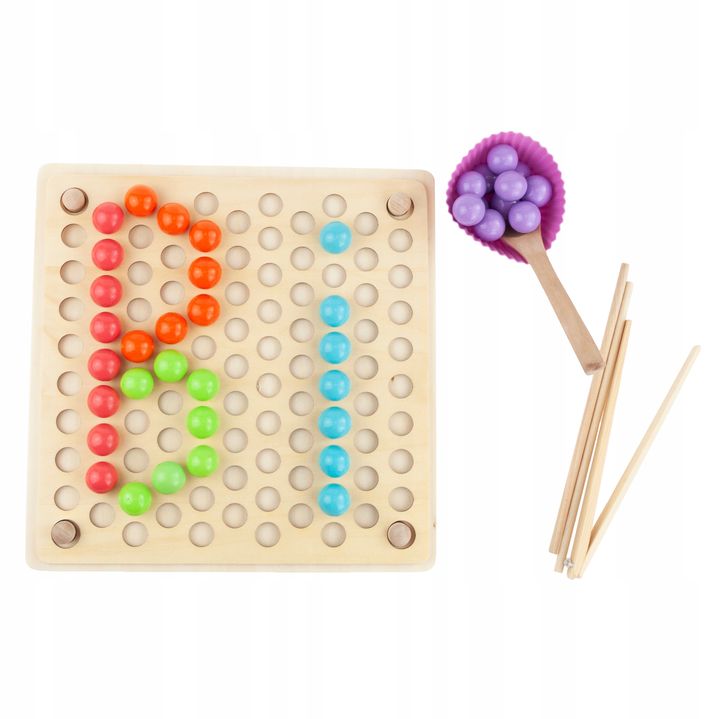 Z każdym ułożonym obrazkiem rośnie pewność siebie i zwiększają się możliwości zabawy. Kolorowa mozaika ćwiczy cierpliwość, uczy planowania i logicznego myślenia. Układanka to również doskonały sposób na ćwiczenie małych rączek i zdolności manualnych. Na początku należy wybrać (wyłowić) potrzebną kulkę z grupy innych, potem odpowiednio ustawić go w małych paluszkach, a następnie trafić nim w dziurkę w planszy. Wszystko to doskonale ćwiczy precyzję ruchów dłoni u dziecka, co zaprocentuje w przyszłości.