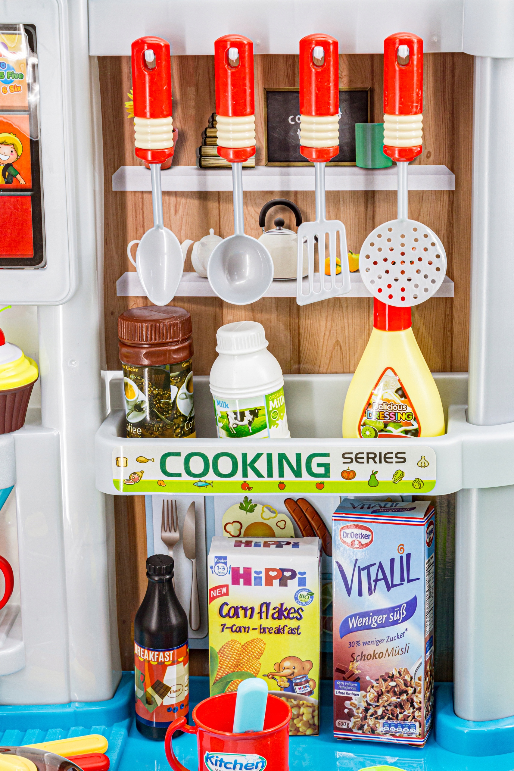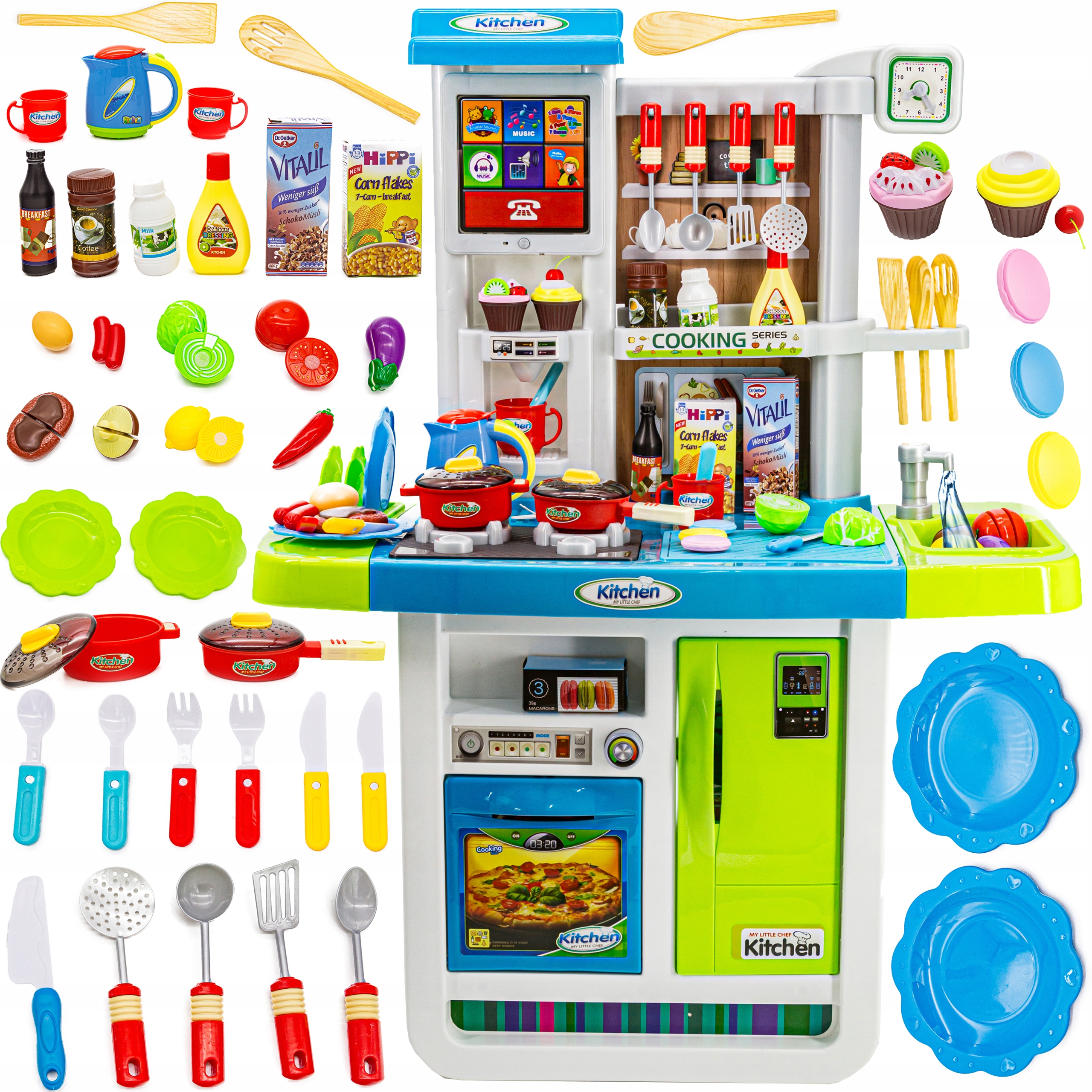 Do dyspozycji małej gospodyni/gospodarza jest cała gama naczyń, garnków i sztućców. Nie zapomniano również o warzywach, owocach czy opakowaniach kartonowych imitujących produkty mleczne.