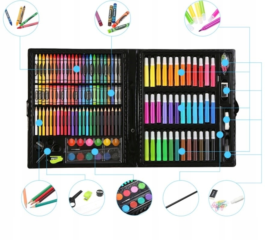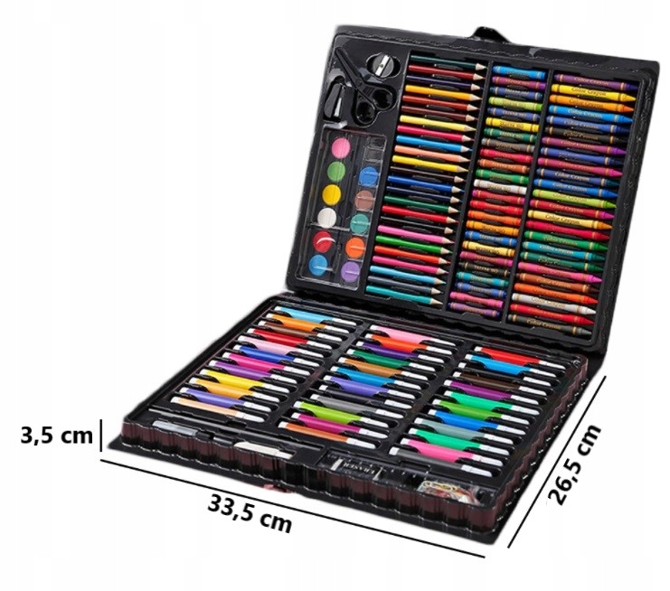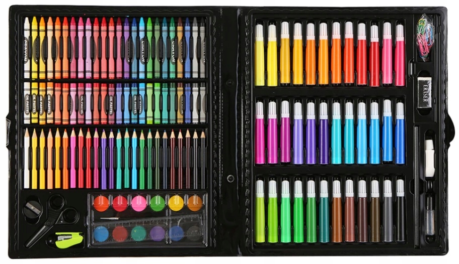 Zestaw artystyczny 150w1 jest świetnym prezentem dla dzieci i młodzieży w wieku szkolnym. Dzięki szerokiej gamie akcesoriów pozwoli na rozwijanie wyobraźni, kreatywności oraz umiejętności artystycznych i manualnych. Produkt nadaje się zarówno dla osób ze smykałką artystyczną uwielbiających tworzyć własne dzieła, jak i dla początkujących artystów, chcących dopiero odkryć swój ukryty talent.