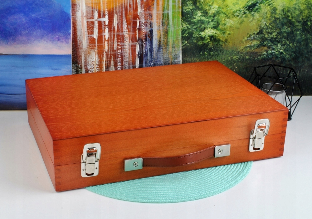 Całość zamknięta jest w przenośnej kompaktowej drewnianej walizce.