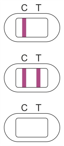 - негативний: лише одна рожева лінія з’являється в контрольній зоні (C). Немає другої лінії у віконці в області тесту (Т) - вагітності немає.