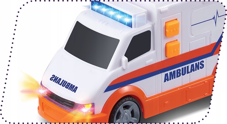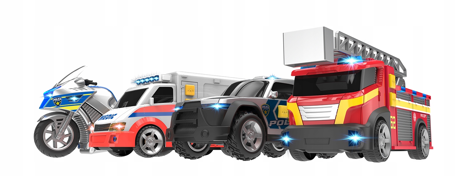 Pojazdy świetlno-dźwiękowe mają awaryjne niebieskie migające światła, dźwięki syreny i realistyczne odgłosy silnika.