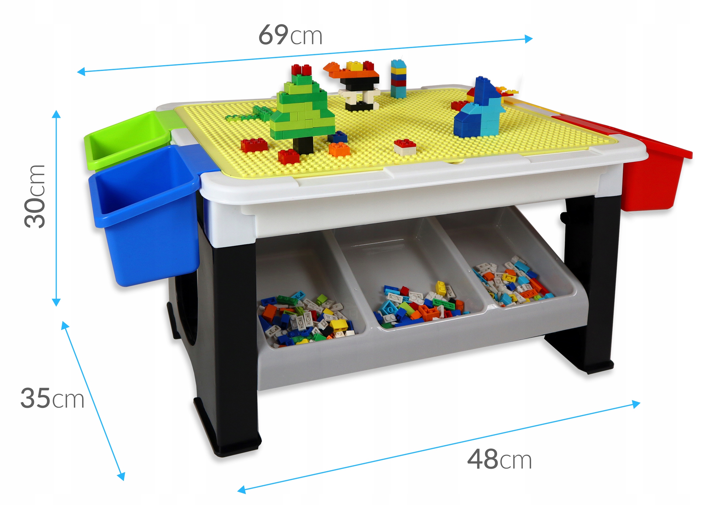 - doczepiane po bokach stolika pojemniki wykonano w kolorach odpowiadających klockom.