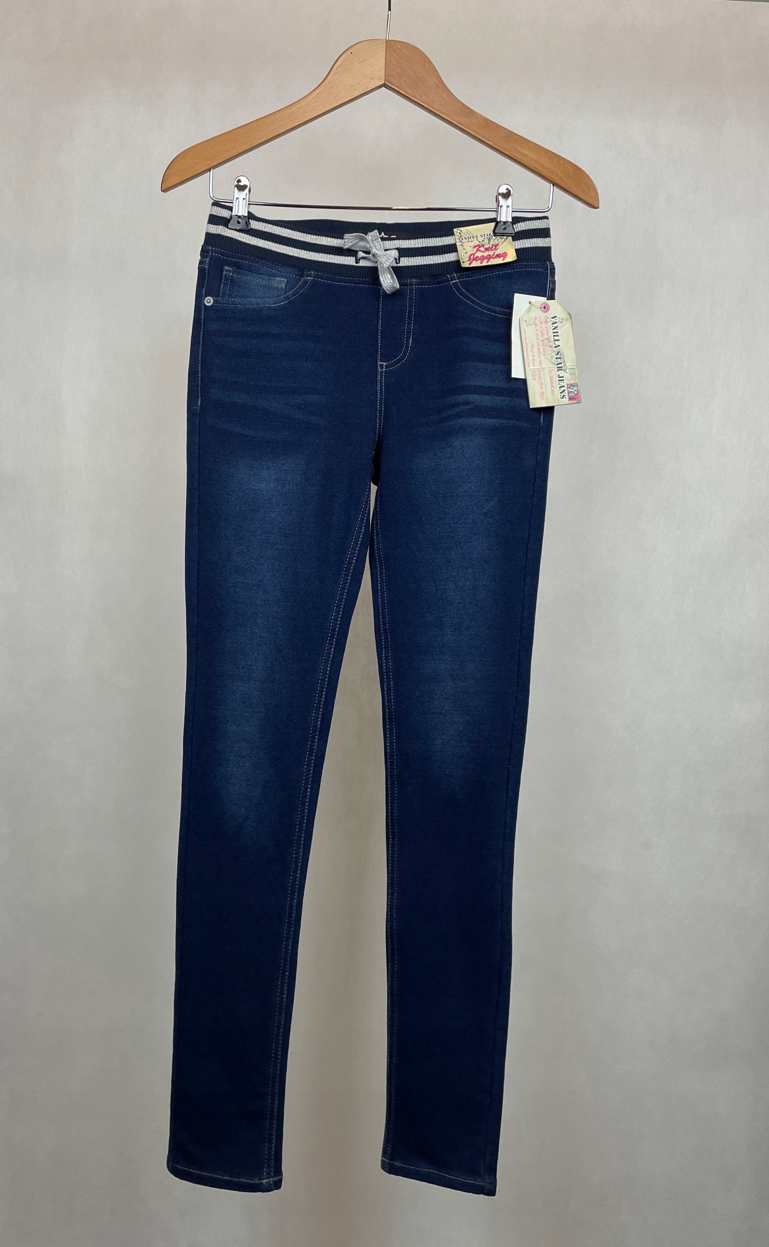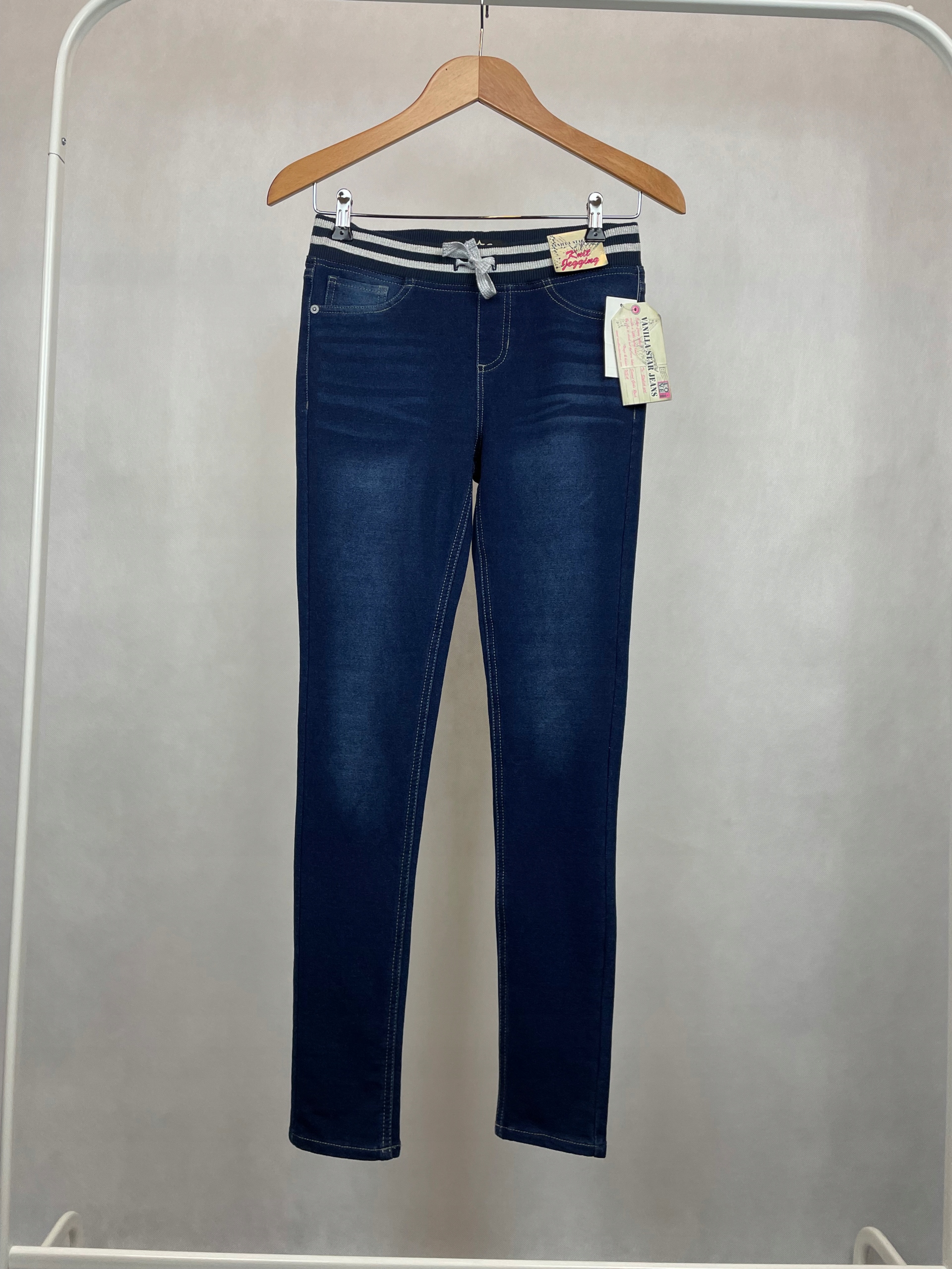 Są w granatowym kolorze, z jaśniejszymi plamkami tworzącymi efekt sprania lub przetarcia jeansu. Mają bardzo miękki materiał dopasowujący się do ciała. Spodnie są elastyczne, z pewnością będą bardzo wygodne. Rozmiar z metki to 14 lat. W celu lepszego dopasowania rozmiaru zachęcamy do zapoznania się z wymiarami podanymi poniżej.