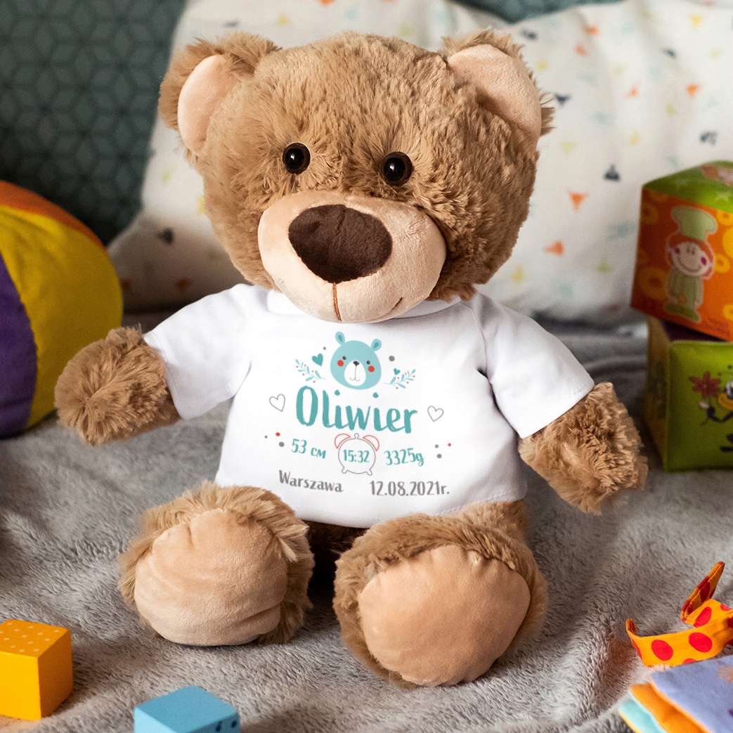 MIŚ W KOSZULCE Z METRYCZKĄ DZIECKA - MIŚ Z IMIENIEM - IDEALNY PREZENT Z OKAZJI DNIA DZIECKA, ROCZKU, NARODZIN CZY CHRZTU!