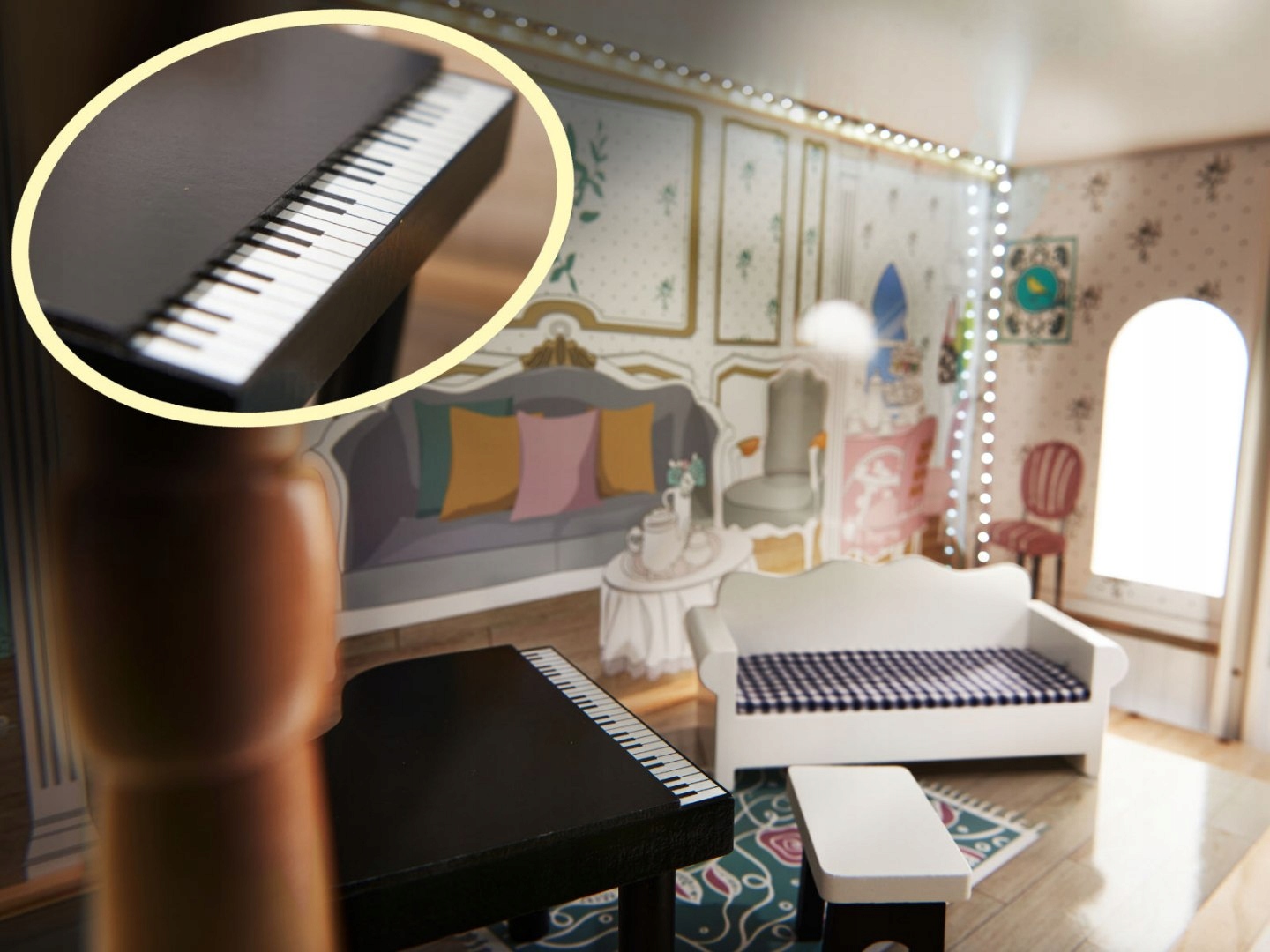 Miniaturki mebli, grafiki na ścianach i oświetlenie LEDtworzą domek wyjątkowym i sprawią, że jest bardzo przytulny.