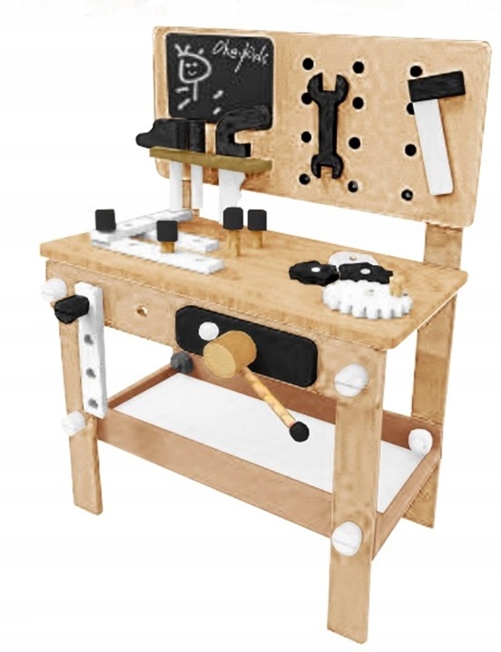 Mała tablica kredowa będzie dodatkową atrakcją i pozwoli rozpisać plan działania lub rozrysować projekt. Wspaniała zabawka, która przeniesie dziecko w świat dorosłych i pozwoli wczuć się w rolę prawdziwej ,,złotej rączki".