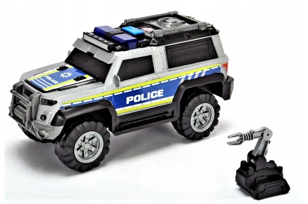 Pojazd policyjny ma otwierane tylne drzwi. Efekty świetlne i dźwiękowe. Robot również jest częścią opakowania. Długość samochodu wynosi 30 cm. Wymagane baterie 21,5V R6/AA
