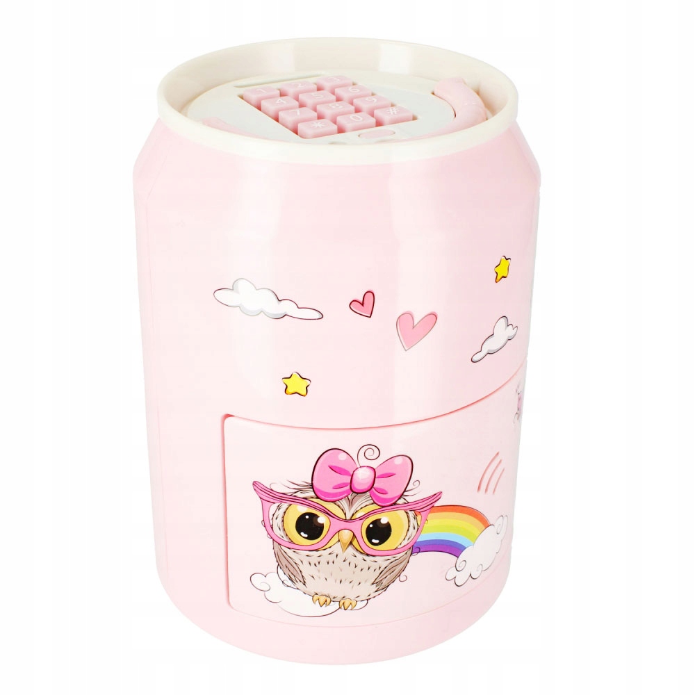 Rewelacyjna skarbonka w kolorze pudrowego różu z motywem Sówki od MEGA CREATIVE w kształcie puszki z napojem z rączką nauczy nasze dzieci oszczędności i planowania wydatków.