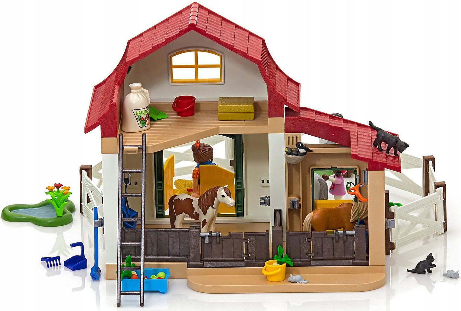 W dwóch zamykanych boksach stajennych znajdują się drzwi prowadzące konie wprost do przestronnej zagrody. Przestronne pomieszczenie na siodła wyposażone jest w realistycznie wyglądające akcesoria.