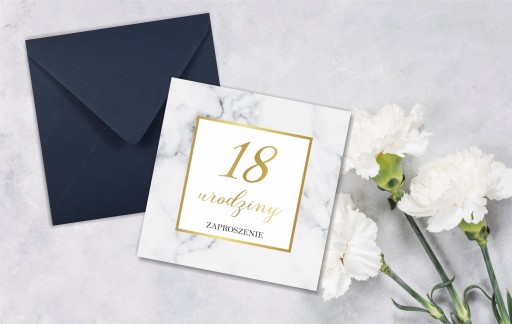 Сучасне запрошення на 18-річчя з мотивом мармуру в поєднанні з золотистими аксесуарами. Запрошення виконано на цупкому атласному папері. Запрошення повністю персоналізоване. Крім того, до запрошення додається декоративний конверт.