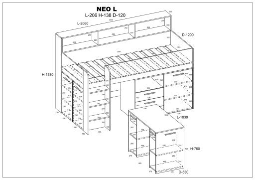 Антресоль НЕО - це поєднання односпального ліжка, висувного столу і місця для зберігання у вигляді відкритих полиць, трьох ящиків і закритих шаф. Сучасний предмет меблів буде виглядати чудово, а різноманітність кольорів означає, що кожен знайде щось для себе.