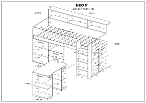 Антресоль НЕО - це поєднання односпального ліжка, висувного столу і місця для зберігання у вигляді відкритих полиць, трьох ящиків і закритих шаф. Сучасний предмет меблів буде виглядати чудово, а різноманітність кольорів означає, що кожен знайде щось для себе.