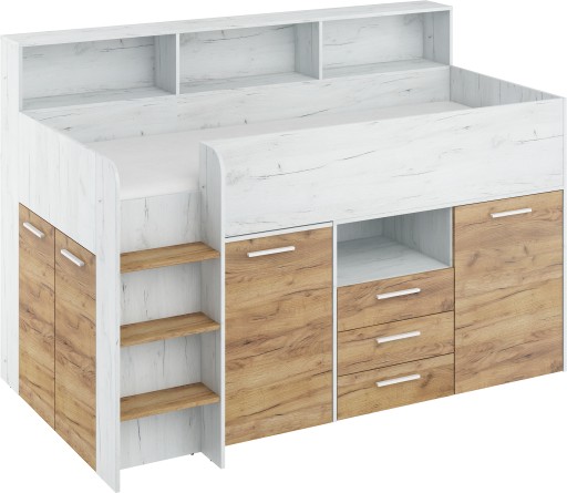 Антресоль НЕО - це поєднання односпального ліжка, висувного столу і місця для зберігання у вигляді відкритих полиць, трьох ящиків і закритих шаф. Сучасний предмет меблів буде виглядати чудово, а різноманітність кольорів означає, що кожен знайде щось для себе.