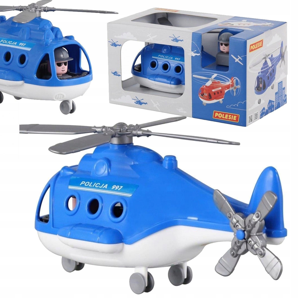 Śmigłowiec policyjny marki Polesie, który sprawi wiele radości każdemu dziecku, które lubi się bawić w pilota lub naśladować żołnierza. W zestawie znajduje się helikopter z ruchomym śmigłem i ruchomymi kołami oraz wyjmowana figurka pilota/żołnierza. Zabawka wykonana z ogromną starannością, z najwyższej jakości materiałów.