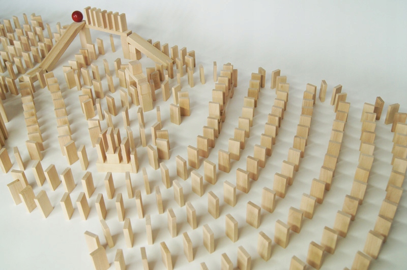 Komplet zawiera 800 szt. domina + 30 sztuk klocków drewnianych wykonanych z drewna bukowego w kolorze naturalnym. które gwarantują nie tylko dobrą zabawę, ale także naukę kreatywności i logicznego myślenia. Zestaw wzbogacony o 30 dodatkowych klocków, umożliwiających tworzenie z klocków tzw. "kulodromu".