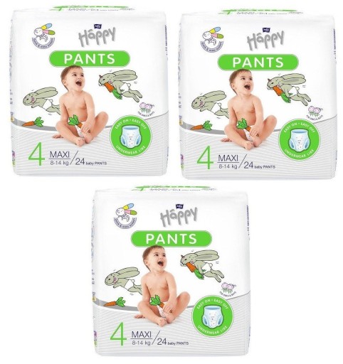 Підгузки Happy Pants Maxi призначені для дітей вагою 8-14 кг, які повзають або вчаться ходити. Дитина на цьому етапі розвитку не тільки дуже активний і рухливий, але і нетерплячий. Тому зміна підгузників має бути швидкою та легкою, не відволікаючи малюка від ігор. Happy Pants легко надягати - достатньо одного руху, щоб натягнути їх як звичайну білизну, і в той же час вони характеризуються високою поглинальністю, забезпечуючи комфортне відчуття сухості для дитини.