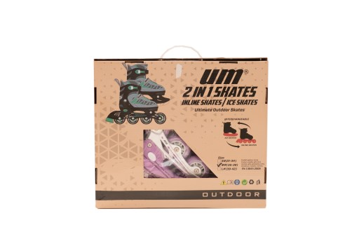 Вага ковзанів - 1,05 кг, вага роликів - 1,68 кг. Товар упакований в кольорову картонну коробку.