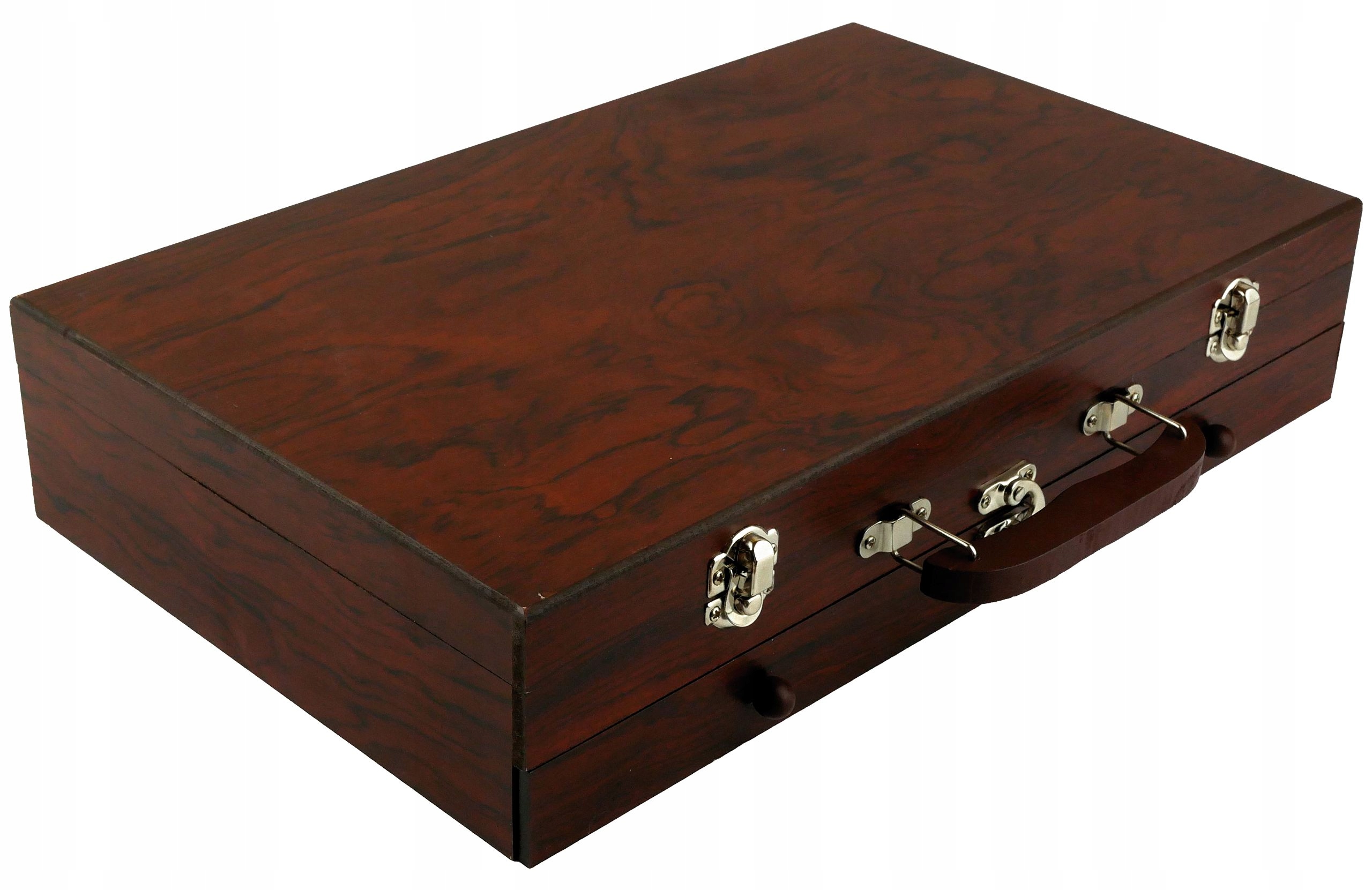 Całość zamknięta jest w przenośnej kompaktowej drewnianej walizce.