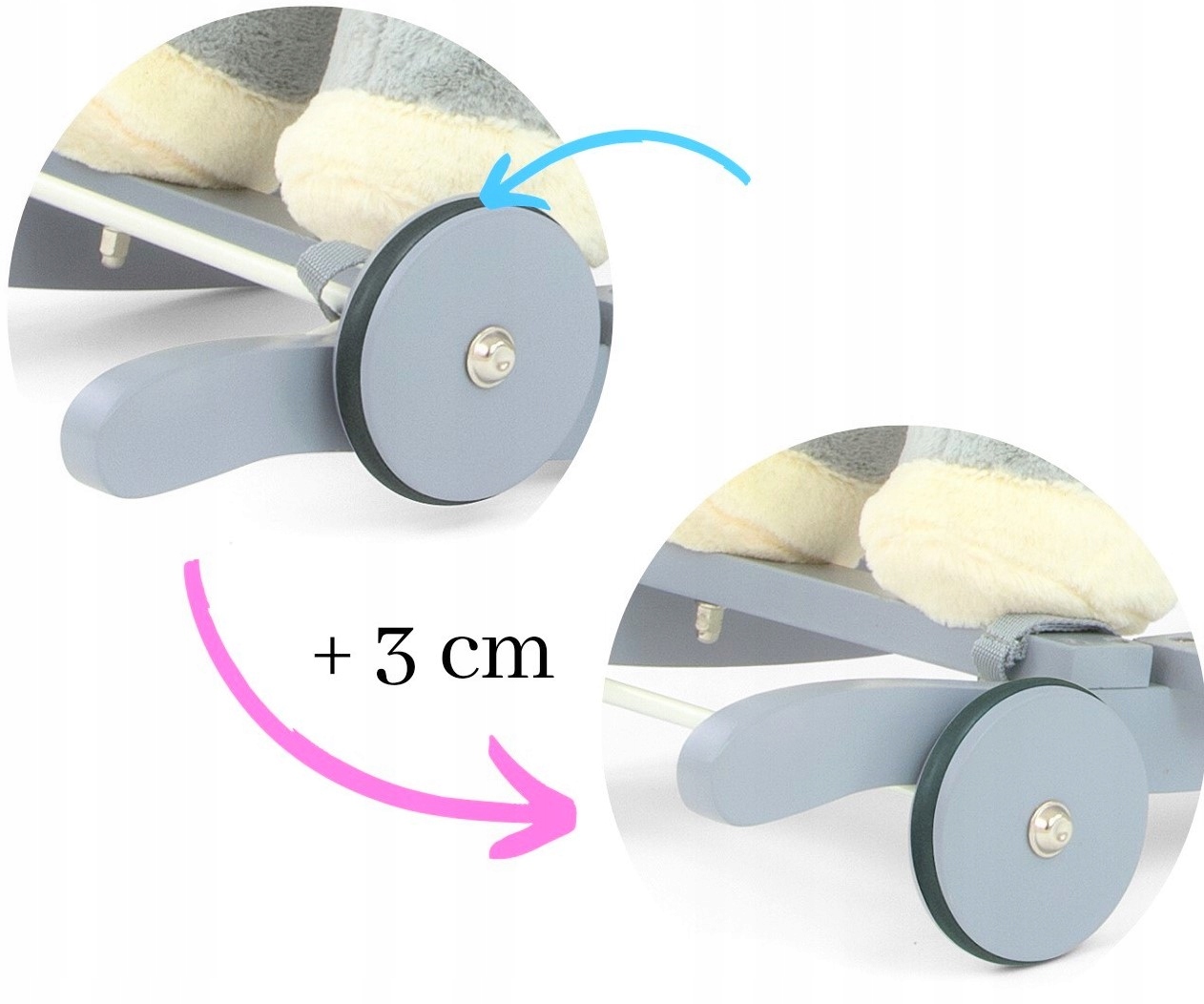 Konik posiada drewniane bieguny z podnóżkami i rączki, które pomogą zachować równowagę podczas zabawy oraz zestaw składanych kółek, dzięki którym w kilka sekund można zamienić go w cudowny pluszowy pojazd.