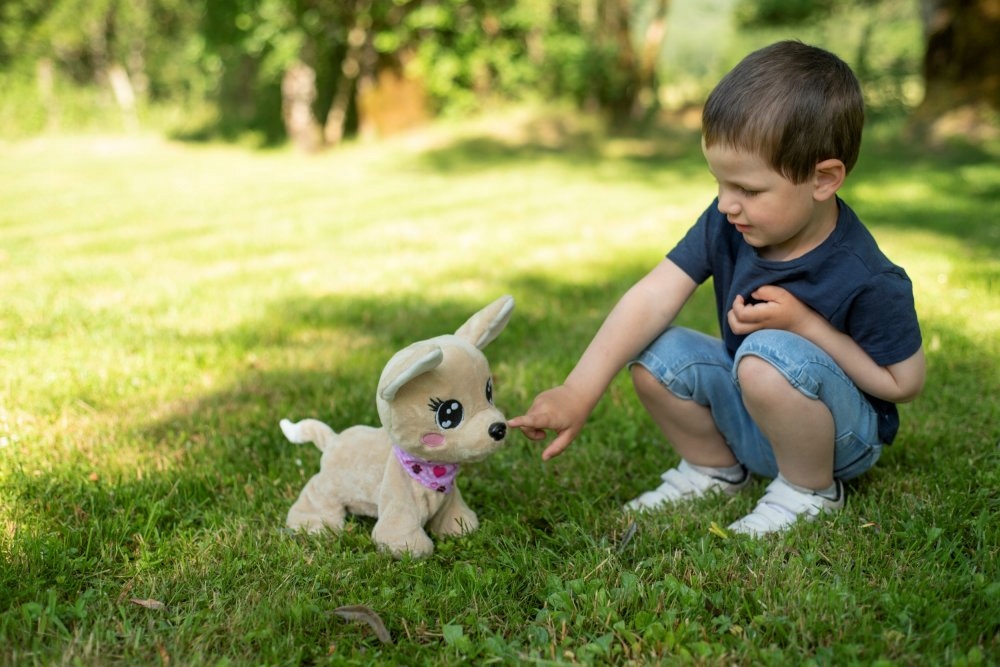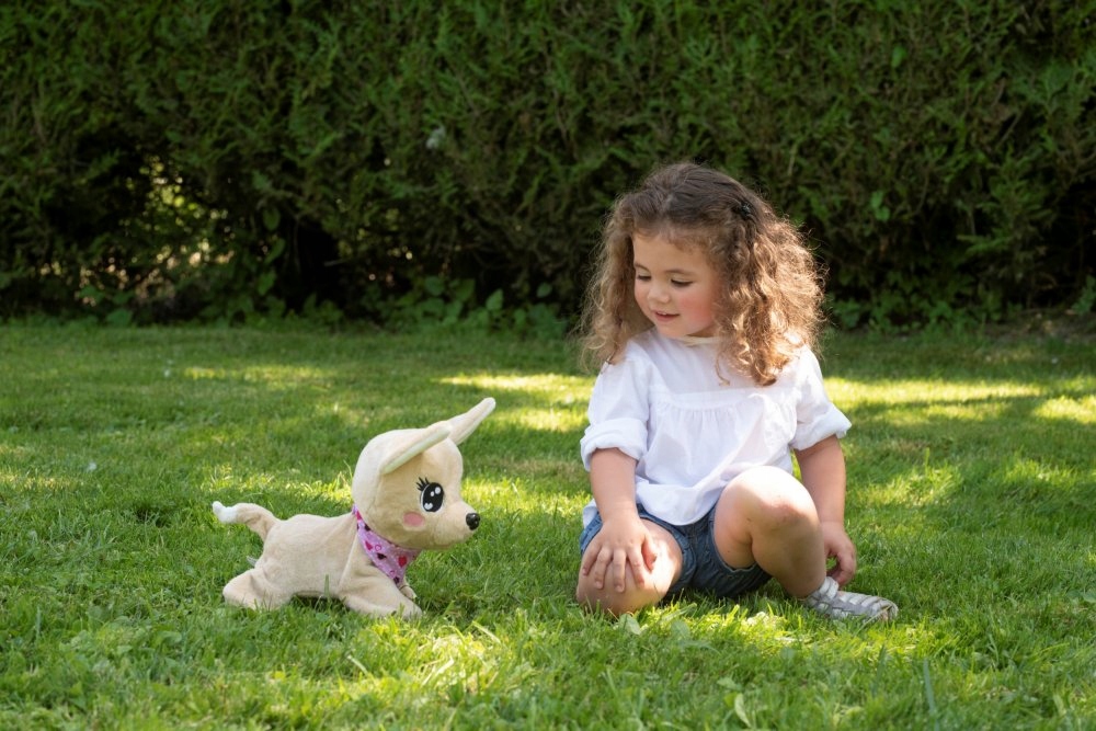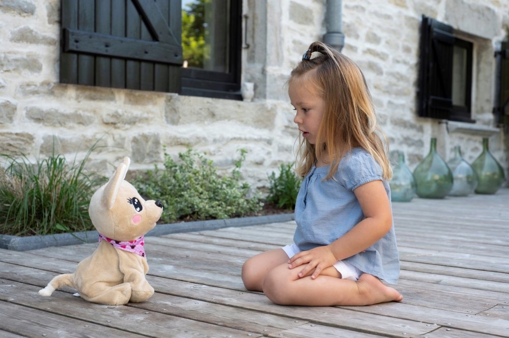 Interaktywny Piesek Baby Boo z serii Chi Chi Love to wspaniały towarzysz zabaw i prawdziwy przyjaciel dzieci. Wystarczy okazać mu odrobinę miłości, zabrać do domu, a na pewno zamieni każdą chwilę w cudowną przygodę. Pluszowy piesek wygląda jak prawdziwy szczeniak Chihuahua, uszyty został z przyjemnego w dotyku pluszu, dlatego przytulanie jego to niezwykła przyjemność. Niewątpliwie uroku dodaje mu różowa chustka z motywem serduszek i psich łapek. Baby Boo reaguje na 12 poleceń i wydaje ponad 60 różnych efektów dźwiękowych jak prawdziwy szczeniak. Słodki piesek uwielbia się przytulać i jest bardzo zabawny! Słucha Twoich poleceń i reaguje na Twój głos jak prawdziwy pupil. Chętnie pokaże Ci to, o co go poprosisz a nawet zaśpiewa dla Ciebie! Potrafi też robić sztuczki oraz stać na głowie. A ponieważ tak bardzo Cię kocha, to okazuje te uczucia. Będziecie się razem świetnie bawić! W opakowaniu znajduje się instrukcja, która wyjaśnia jak bawić się z Baby Boo