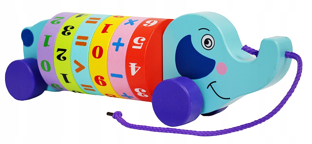 Zabawkę można ciągnąć za sznurek, na tułowiu zwierzątka są umieszczone kolorowe, drewniane obracane kółka. Przekręcając je odpowiednio możemy układać proste działania matematyczne.