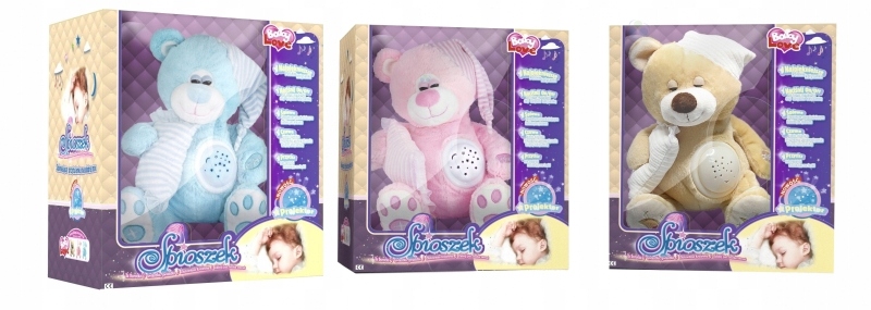 * wbudowana lampka/projektor - za jej pomocą miś rozświetli ciemności w pokoju dziecka wyświetlając różnokolorowe gwiazdki na ścianach bądź suficie
