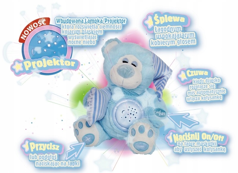 * wbudowana lampka/projektor - za jej pomocą miś rozświetli ciemności w pokoju dziecka wyświetlając różnokolorowe gwiazdki na ścianach bądź suficie