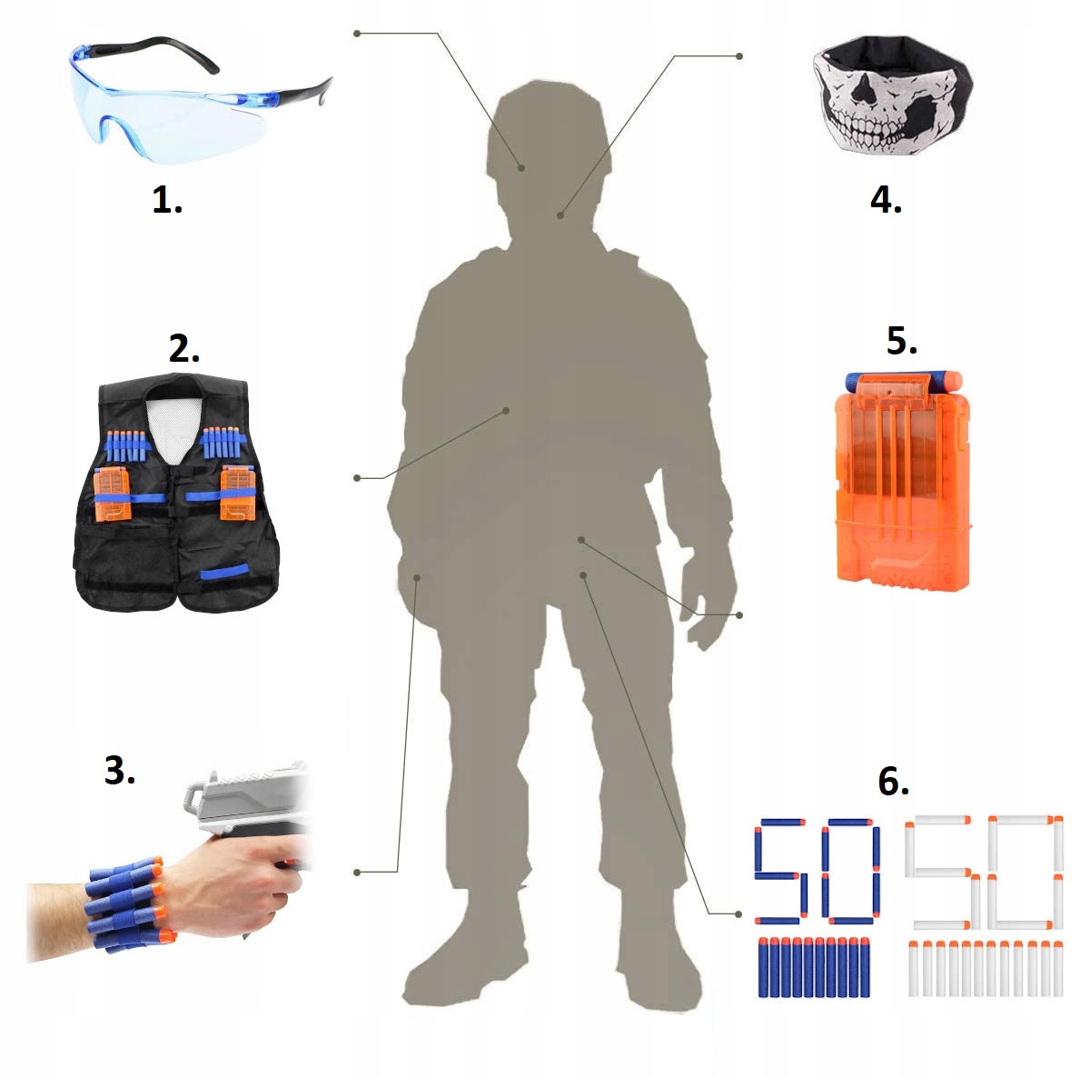 Wyposażenie na polu bitwy to podstawa. Dzięki kamizelce taktycznej z miejscem na 4 magazynki, dodatkowe strzałki oraz niewielką wyrzutnię będziesz mieć wszystko pod ręką, a Twoi przeciwnicy będą bez szans!