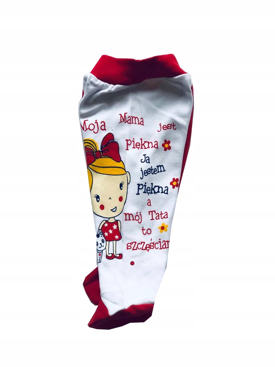 - jedna nogawka w kolorze czerwonym, druga biała z zabawnym napisem.