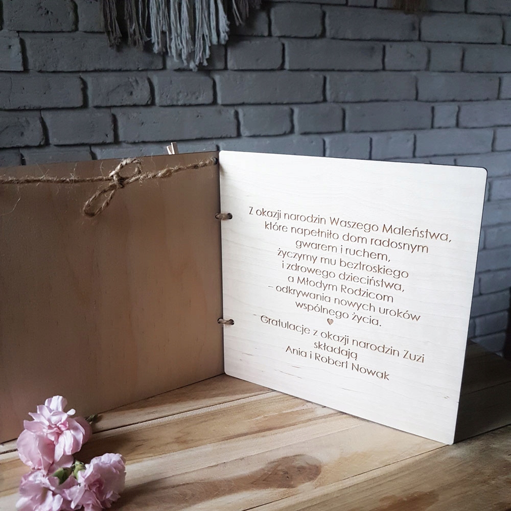 Ramka jest wykonana z drewna, grawerowana. Wymiary jednej części: 17x17 cm. Połączone sznureczkiem jutowym.