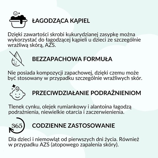 Завдяки вмісту кукурудзяного крохмалю порошок можна використовувати для заспокійливих ванн для дітей з особливо чутливою шкірою та атопічним дерматитом. Вам не доведеться турбуватися про подразнення ніжної шкіри дитини під час купання.