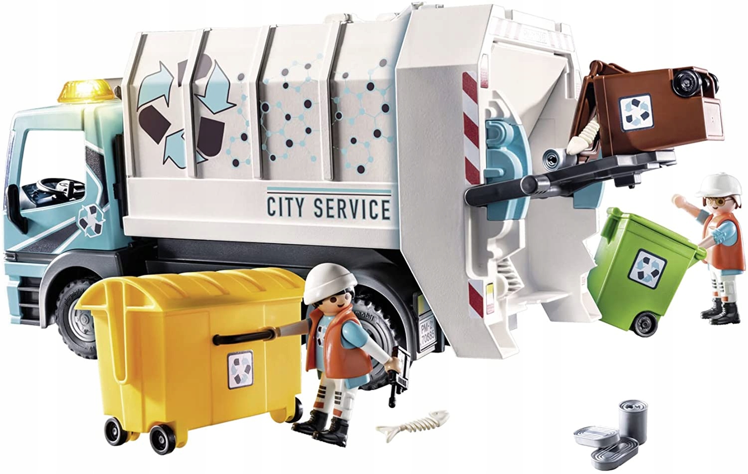 Zabawa z wywozem śmieci Playmobil: śmieciarka Playmobil z migającym światłem i zdejmowanym dachem, 2 kosze na śmieci, 1 kontener i wiele więcej.
