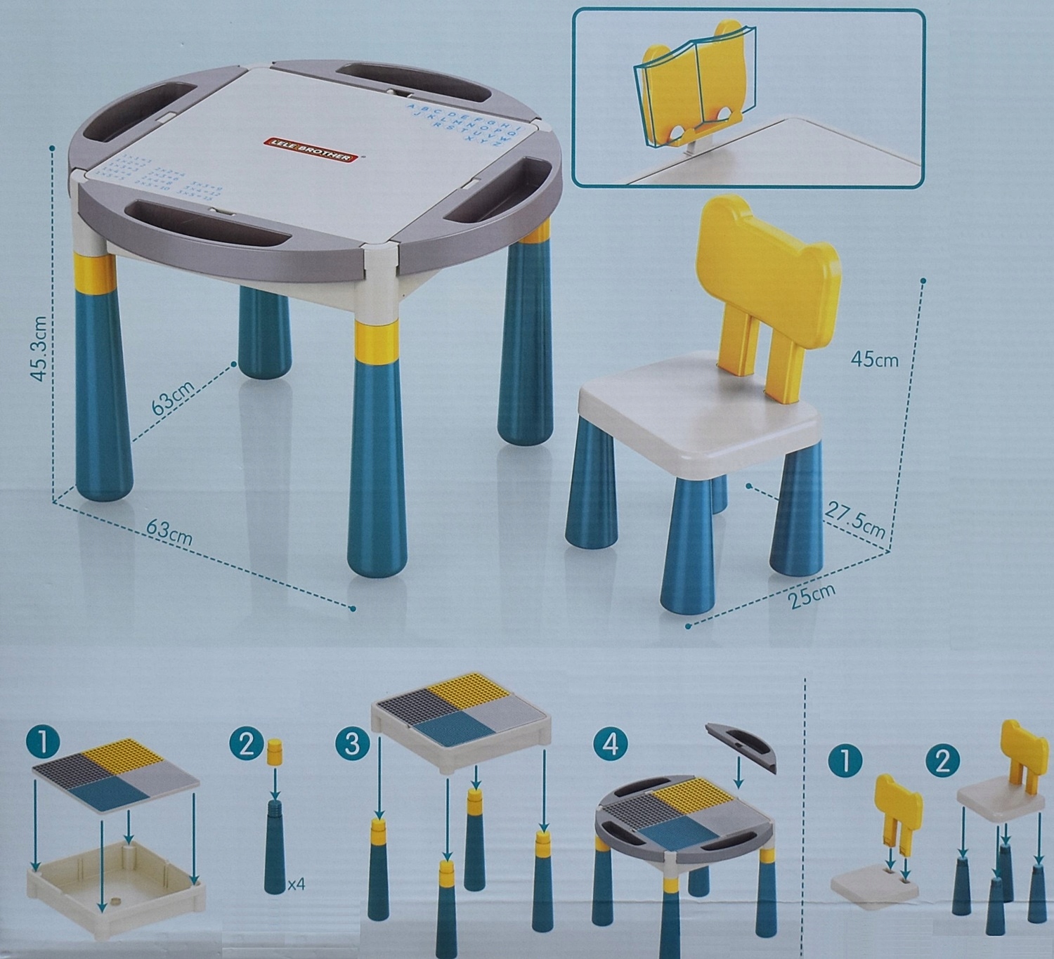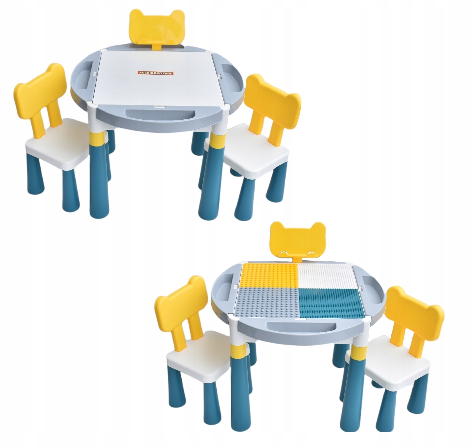 Wielofunkcyjny zestaw 2x krzesełko plus stolik z planszą do popularnych klocków oraz schowkiem i czterema pojemnikami