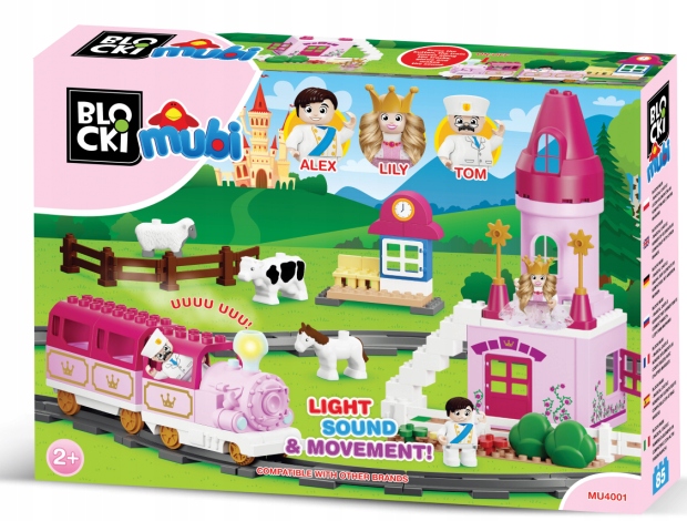 Komplet klocków łączy w sobie elegancję pałacu księżniczek i radość z podróży królewskim pociągiem! W zestawie znalazł się piękny zamek Księżniczki Lily, a także fantastyczny różowy, królewski pociąg, który sam jeździ, mruga światłami, a nawet wydaje odgłosy prawdziwej kolejki! W tym komplecie klocków MUBI nie zabrakło też figurek – poznaj Księżniczkę Lily, Księcia Alexa i maszynistę Toma, który prowadzi królewski pociąg MUBI!