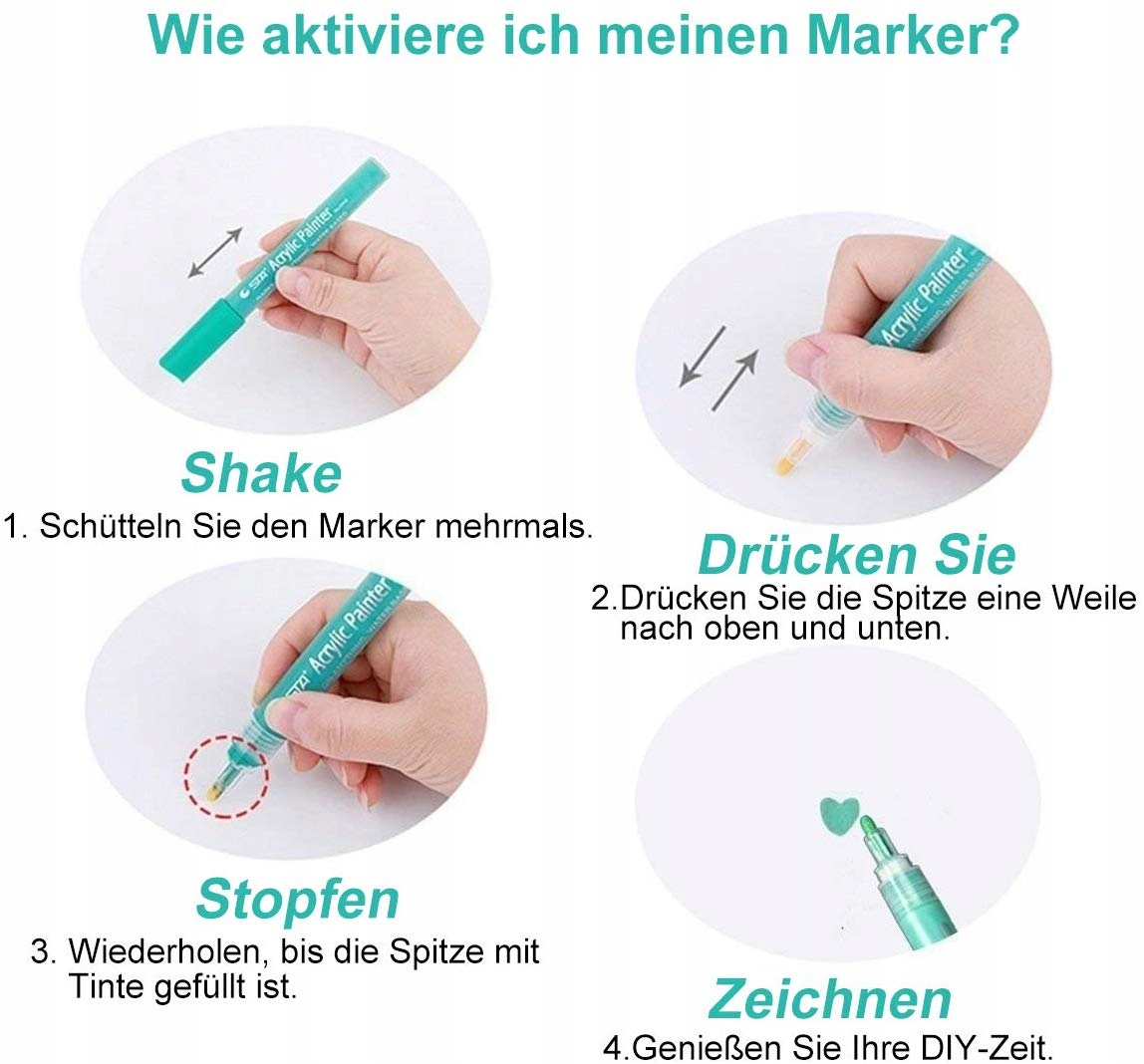 Metalowe kuleczki, które znajdują się w pisakach umożliwiają stałe mieszanie się farby dlatego przed użyciem należy dobrze wstrząsnąć. Po użyciu szczelnie zamknąć zatyczką