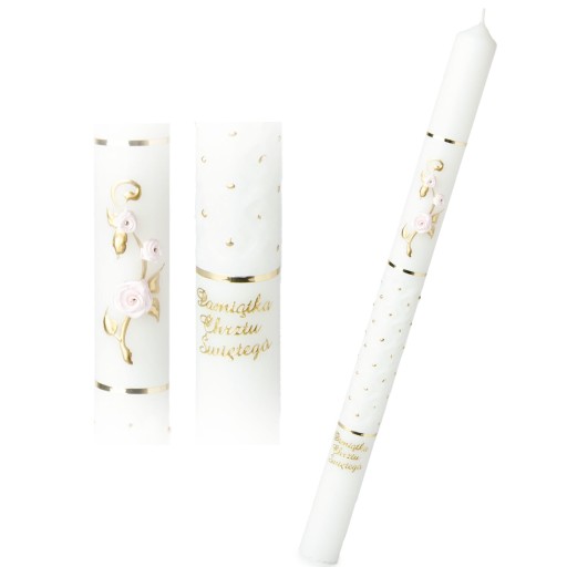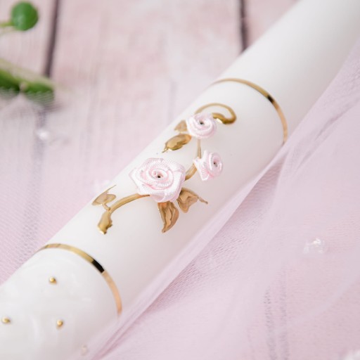 Красива, біла хрещенська свічка, вручну прикрашена тисненням. Крім того, він має ніжні прикраси в тонах рожевого золота. Рожеві троянди, прикрашені золотим розписом, додають йому шарму. Пудрові кольори роблять свічку ідеальною для дівчинки як сувенір на Святе Хрещення.