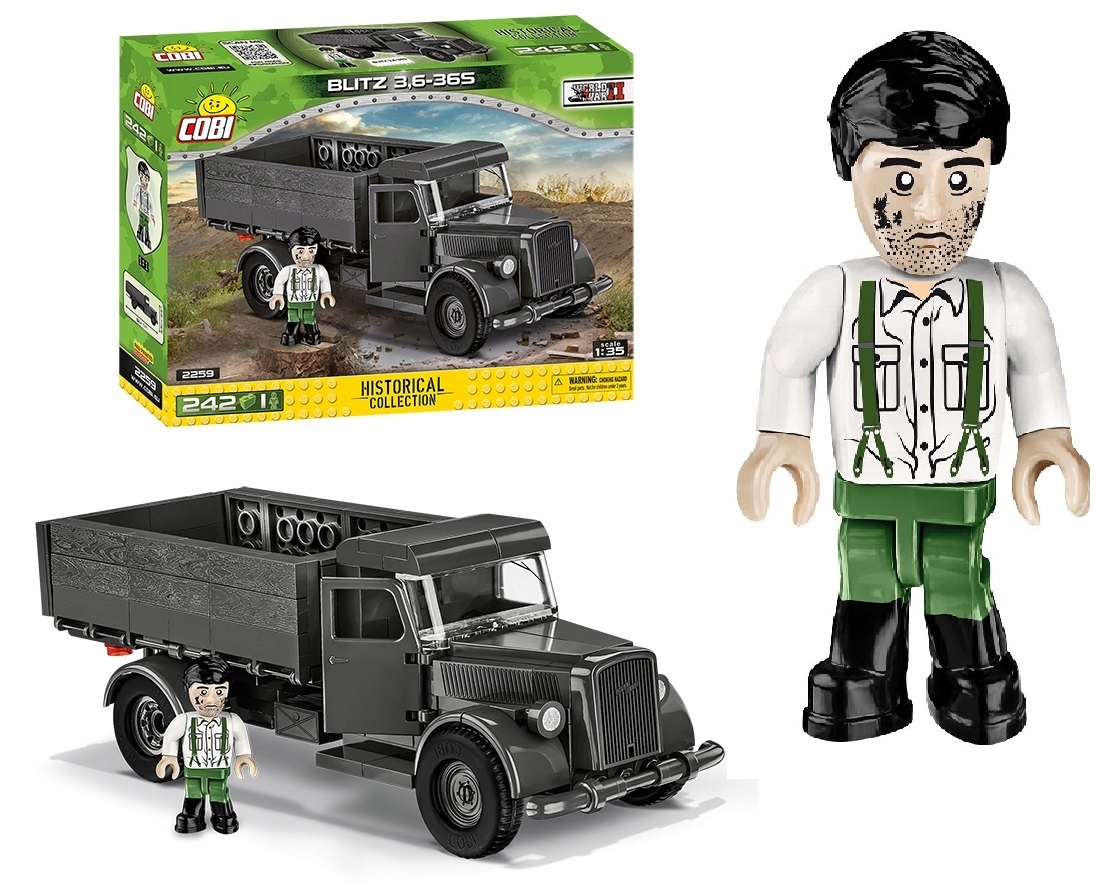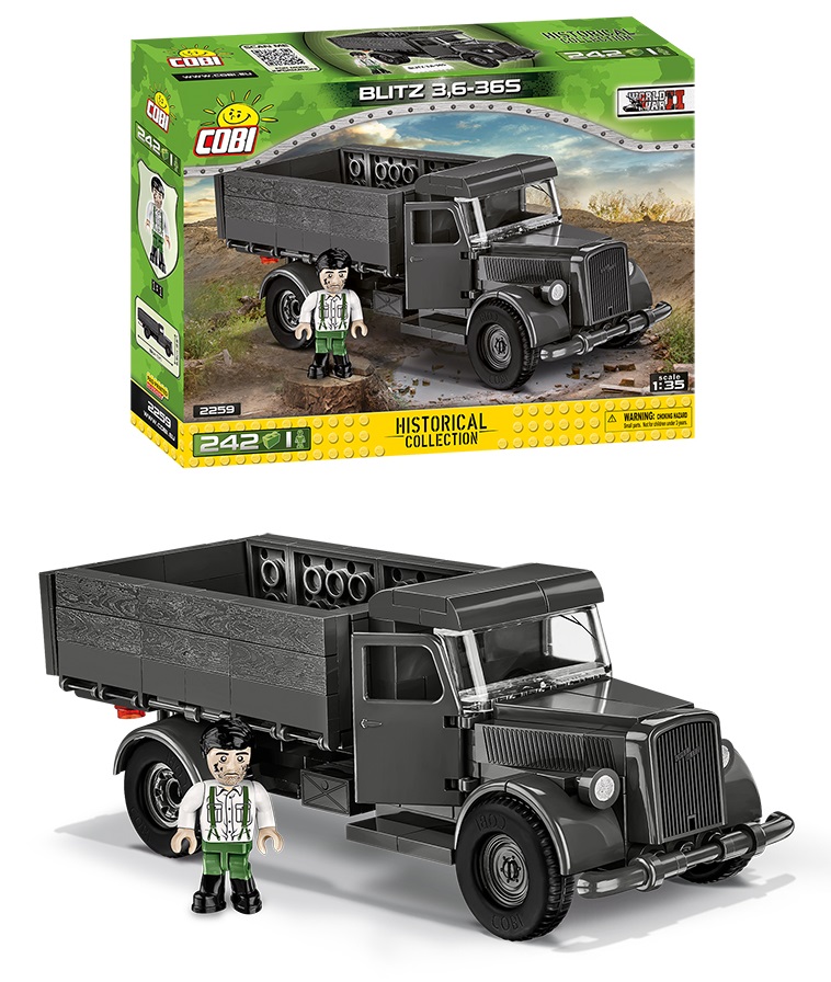 Blitz 3,6-36S to wół roboczy Wehrmachtu. Nie ma chyba bardziej rozpoznawalnej i uniwersalnej ciężarówki kojarzącej się z drugą wojną światową. Blitz w wielu produkowanych wariantach był wykorzystywany na wszystkich niemieckich frontach przez cały okres drugiej wojny światowej!Z zestawu 242 klocków konstrukcyjnych COBI wybudujesz samochód ciężarowy Blitz 3,6-36S. Model zawiera elementy pokryte wysokiej jakości nadrukami, które nie ścierają się nawet w trakcie intensywnego użytkowania. Konstrukcja w wyjątkowy sposób odzwierciedla oryginalne kształty swojego historycznego pierwowzoru w modelarskiej skali 1:35. Pojazd posiada ruchome koła, otwierane drzwi oraz uchylne burty przestrzeni ładunkowej. Samochód zaskakuje nowymi rodzajami klocków, które świetnie sprawdzają się przy budowie pojazdów oraz ułatwiają dalsze przeróbki i projektowanie własnych konstrukcji. Figurka mechanika z wysokimi, nadrukowanymi butami i charakterystyczną główką, na której widać ślady smaru. Dodatkowo w pudełku znajdziemy również klocek z nadrukowaną nazwą zestawu.Blitz 3,6-36S jest idealnym zestawem na początek przygody z polskimi klockami konstrukcyjnymi COBI. Pozycja obowiązkowa dla miłośników militariów, motoryzacji i historii.