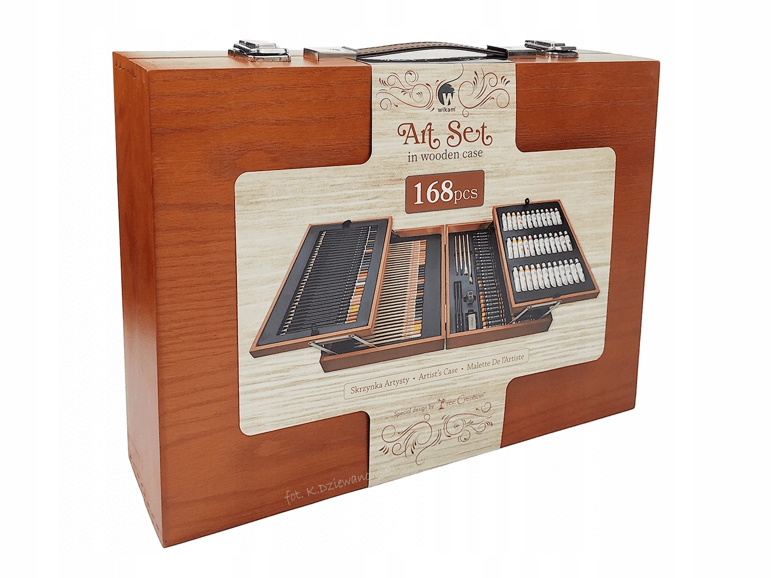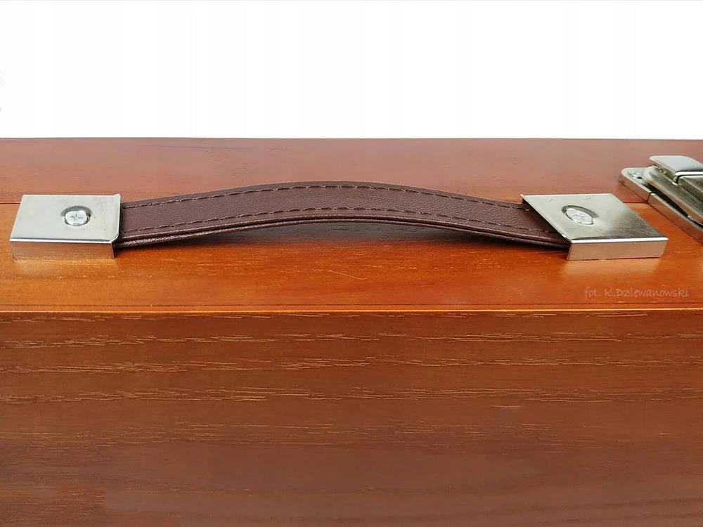 Całość spakowana w drewnianą walizkę, która nadaje uroku i zapewnia przyjemność użytkowania i transportowania.