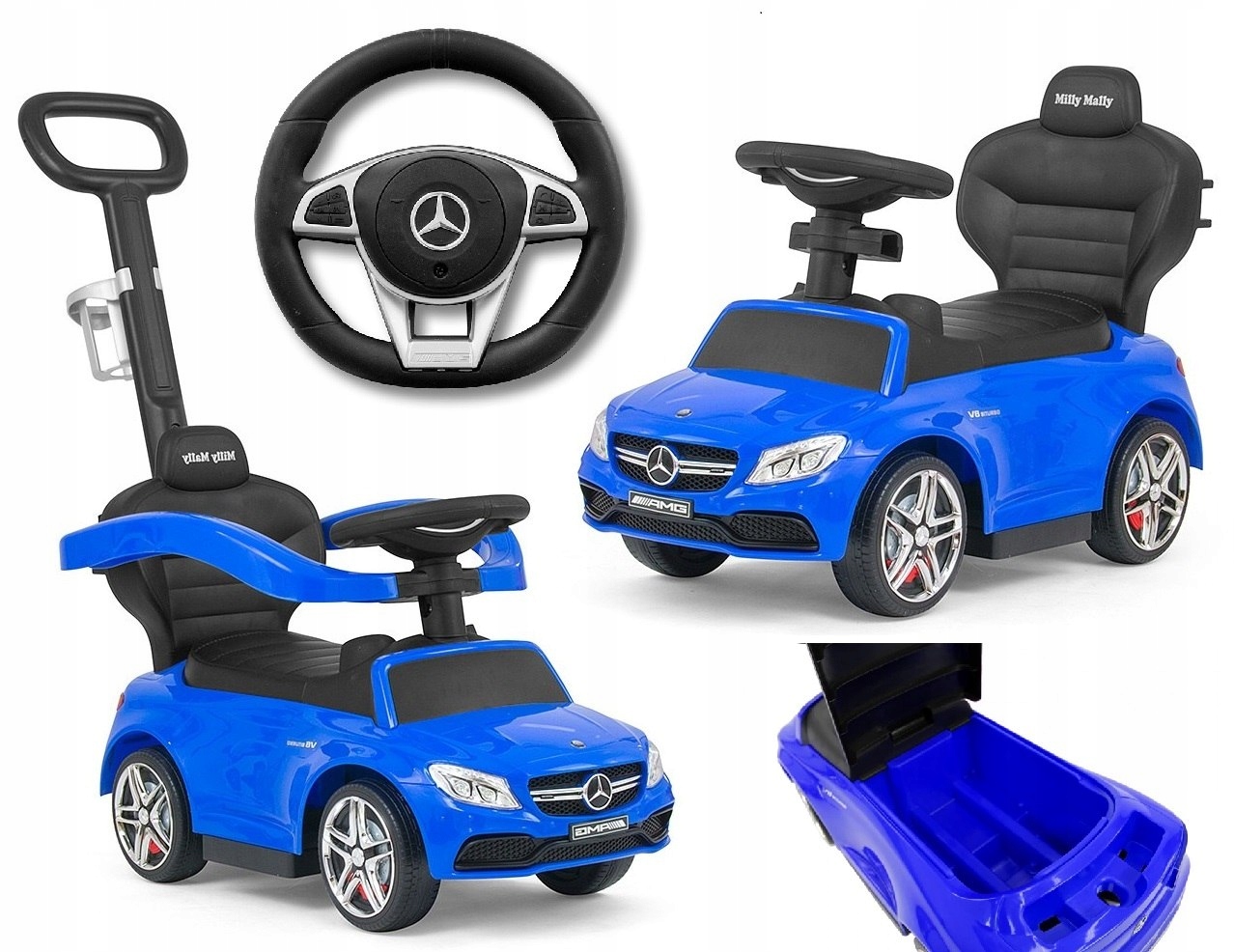 Dodatkowym atutem jest interaktywna kierownica, która sprawi, że zabawa będzie jeszcze ciekawsza! Produkt posiada skrętne koła za pomocą rączki do prowadzenia z uchwytem na butelkę lub kubek, która zapewni komfort prowadzenia podczas spacerów.