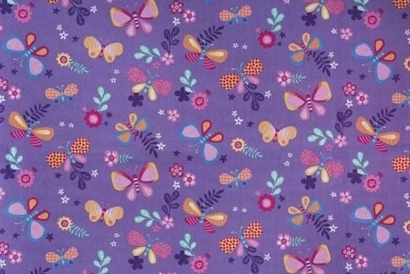 Wykładzina przeznaczona dla dziewczynek przedstawiająca wielobarwne kwadraty z motylkami oraz pięknymi kwiatuszkami.