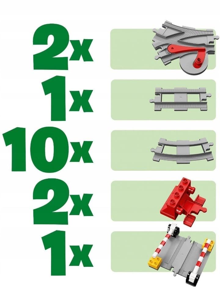 Zestaw obejmuje prosty fragment torów, 10 zakrzywionych fragmentów torów, dwa kozły oporowe, dwie zwrotnice, przejazd kolejowy i czerwony klocek funkcyjny (do zatrzymywania pociągu).
