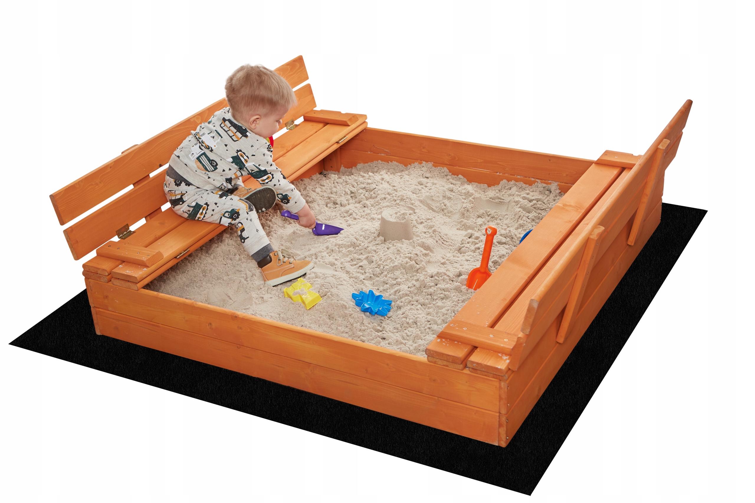 Budowanie zamków z piasku, stawianie „babek”, czy też kopanie dołów łopatką to niezapomniana przygoda dla każdego dziecka. Dużą zaletą naszej piaskownicy jest możliwość składania ławeczek z których tworzymy pokrywę przykrywając tym samym piaskownicę.