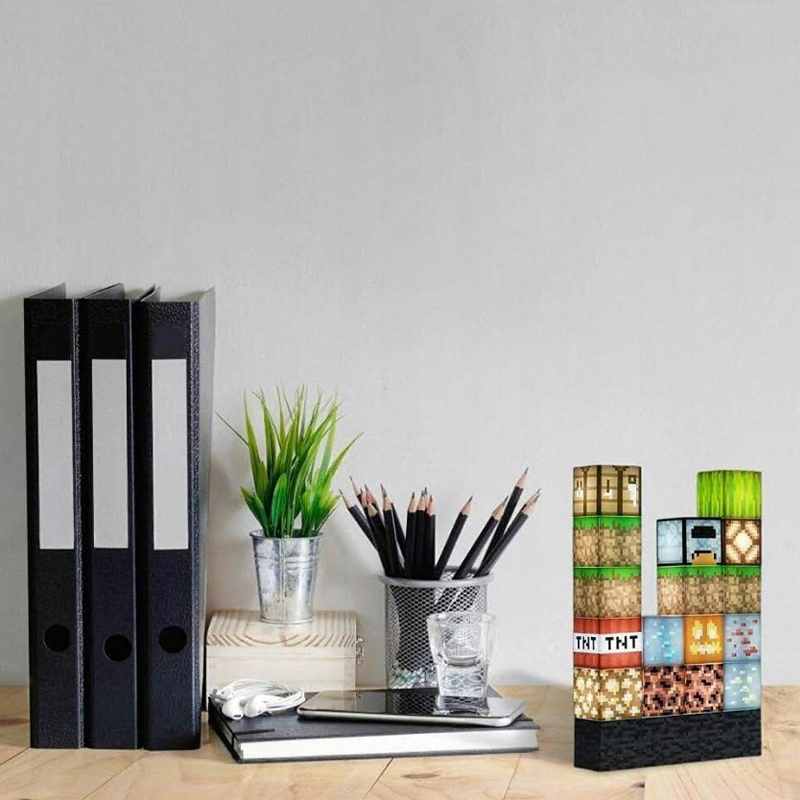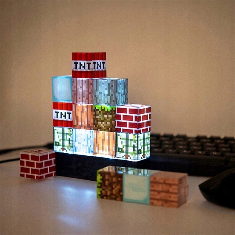 - Lampa posiada bloki o różnych wzorach pikseli, w tym trawę, pudełka, piec, diamenty, stół itp., nadając jej niepowtarzalny i wyjątkowy wygląd.