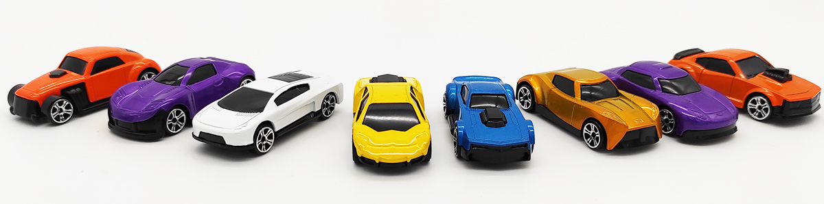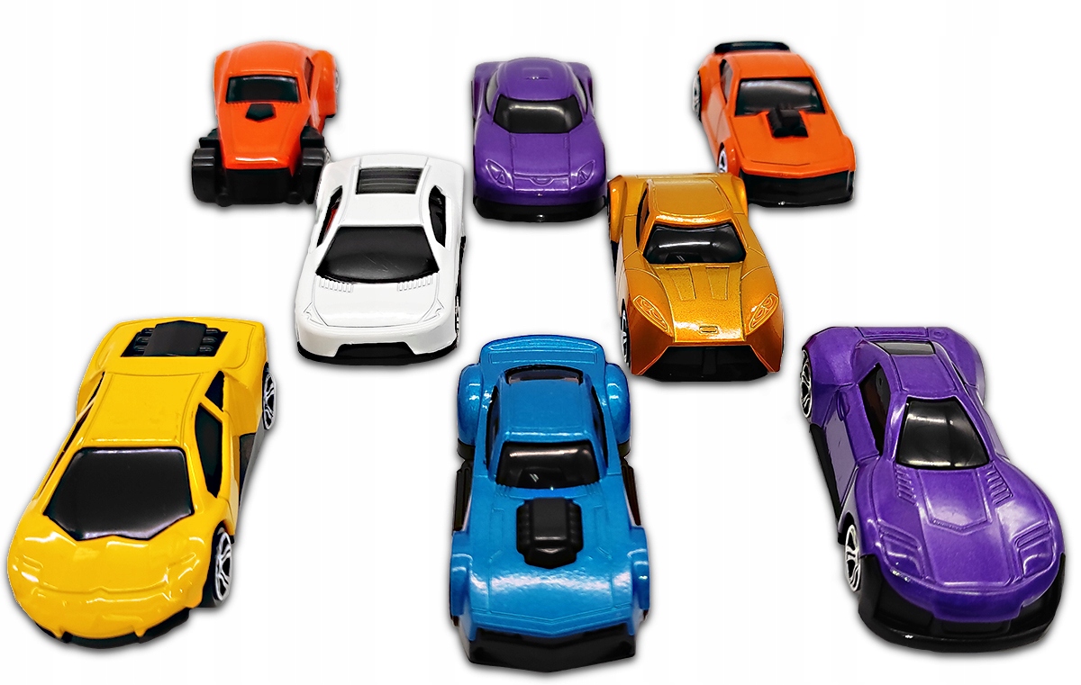 - W zestawie jest 8 metalowych, starannie wykonanych autek.