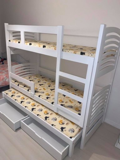- нижнє ліжко висувається за допомогою гумових ручок, середнє служить висувним ящиком для іграшок або постільної білизни