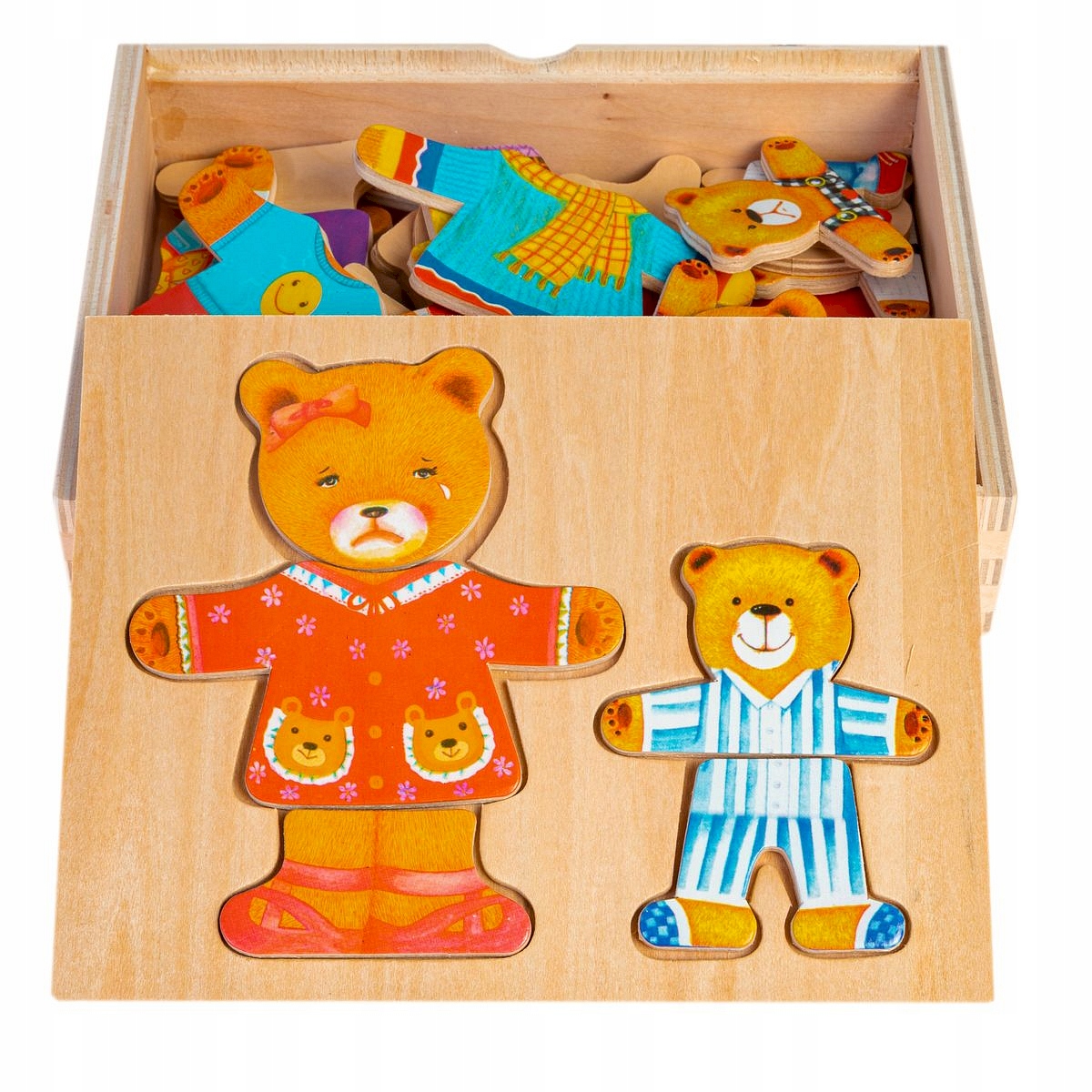 Wszystkie elementy umieszczone są w drewnianym pudełku, co ułatwia utrzymanie zabawki w porządku po skończonej zabawie.