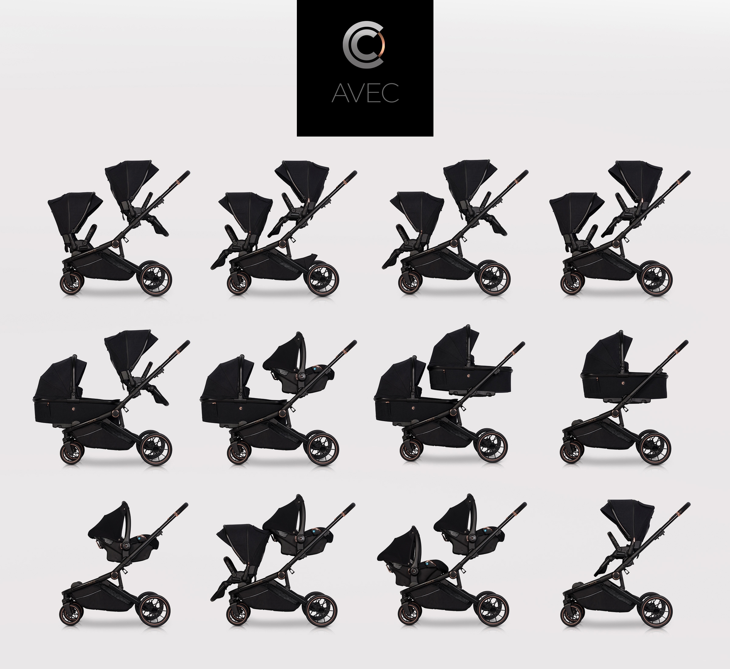 AVEC marki CAVOE jest wózkiem dla dwójki dzieci typu tandem. Oferowany jest jako wózek spacerowy z dwoma pełnowymiarowymi siedziskami z możliwością dokupienia jednej lub dwóch pełnowymiarowych gondoli. Dodatkowo marka CAVOE oferuje możliwość dokupienia uniwersalnych adapterów, za pomocą, których możesz wpiąć jeden lub dwa foteliki samochodowe CAVOE 0+ Isofix Ready lub wybrane foteliki innych znanych światowych marek w tym Maxi Cosi, Cybex i Avionaut.